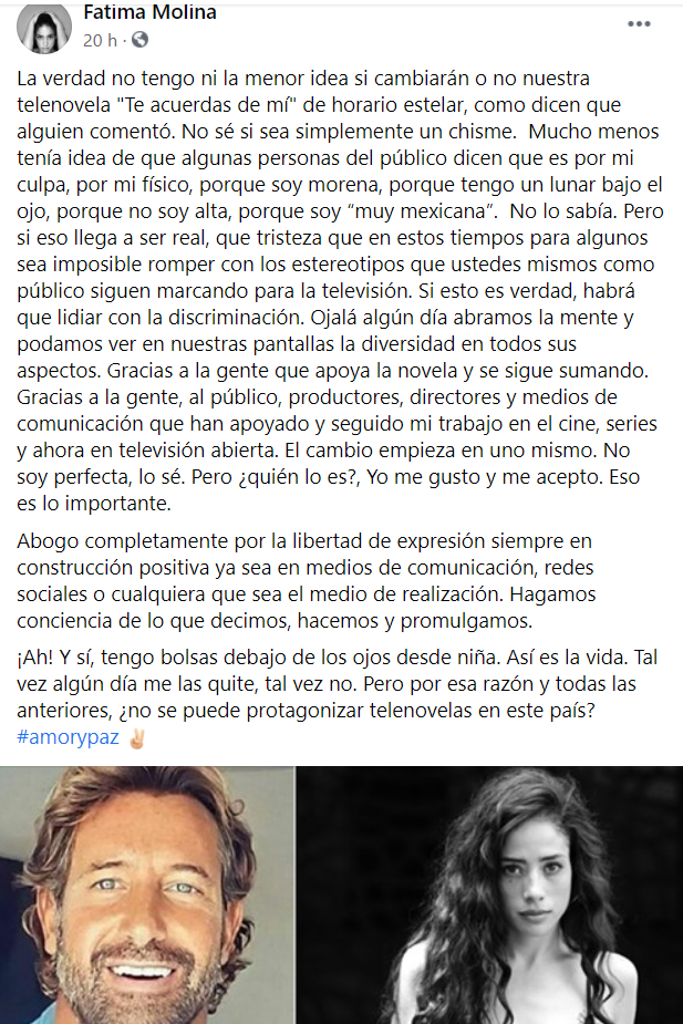 "No tengo ni la menor idea si cambiarán o no nuestra telenovela "Te acuerdas de mí" de horario estelar... Mucho menos tenía idea de que algunas personas del público dicen que es por mi culpa, por mi físico, porque soy morena, porque tengo un lunar bajo el ojo, porque no soy alta, porque soy “muy mexicana”, escribió la actriz en su página de Facebook.Aunque la actriz aclaró que no sabe si los rumores son reales, expresó su tristeza porque en estos tiempos todavía sea imposible romper con los estereotipos.