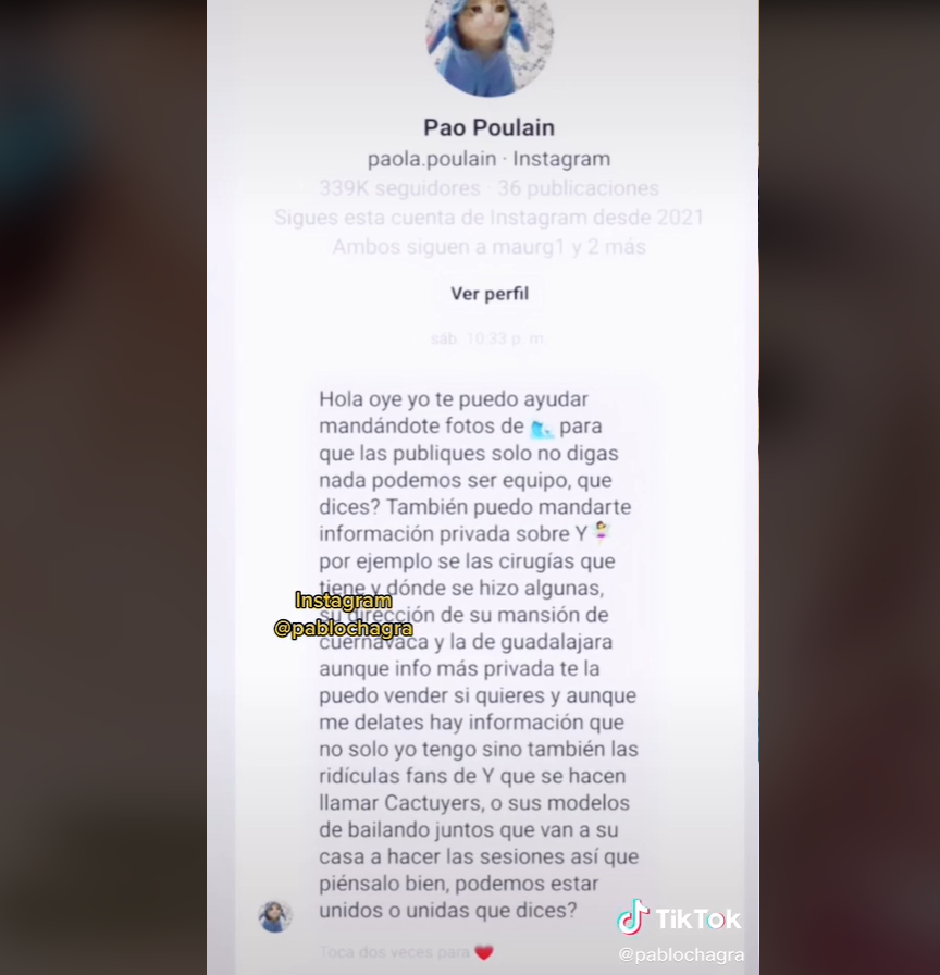 Fue Pablo Chagra, el creador del canal chismillennial, quien mostró en TikTok un supuesto mensaje que habría enviado Paola desde su cuenta de Instagram, ofreciendo información de Mar a cambio de dinero.