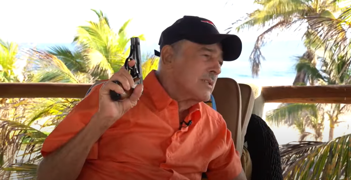 Durante una entrevista para el canal de YouTube de Yordi, el actor estaba narrando sus historias en peleas callejeras, pero confesó que tras su operación de espalda ahora solo usa "un músculo" y sacó una pistola de 9mm corta de su maleta.