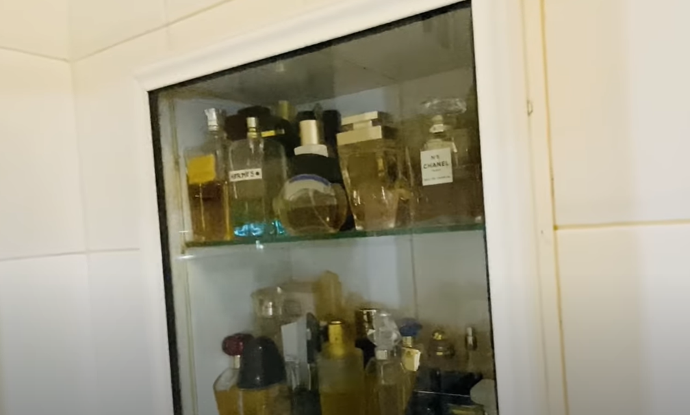 En el baño principal cuenta con un enorme estante donde guarda su colección de perfumes.
