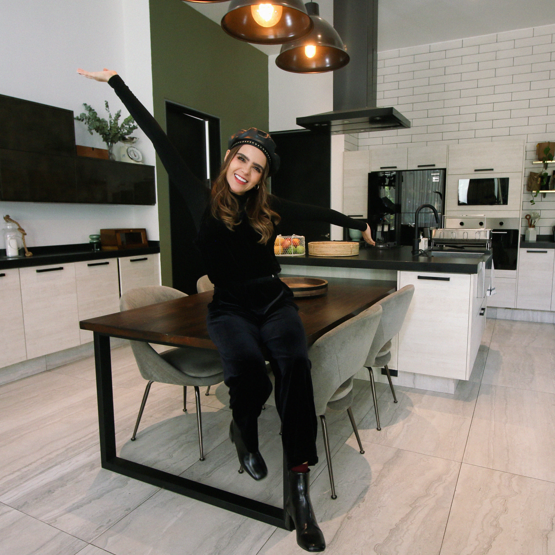 Su cocina tiene un diseño moderno en colores blanco y negro. En la concina tiene una mesa de madera donde come la mayoría de las veces y también la utiliza para trabajar.