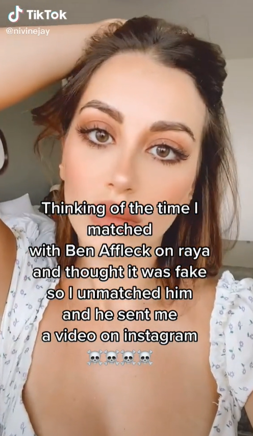 “Pensando en el momento en que coincidí con Ben Affleck en Raya y pensé que era falso... él me envió un video en su Instagram”, escribió la joven en el video de TikTok que ya tiene más de 6 millones de reproducciones.