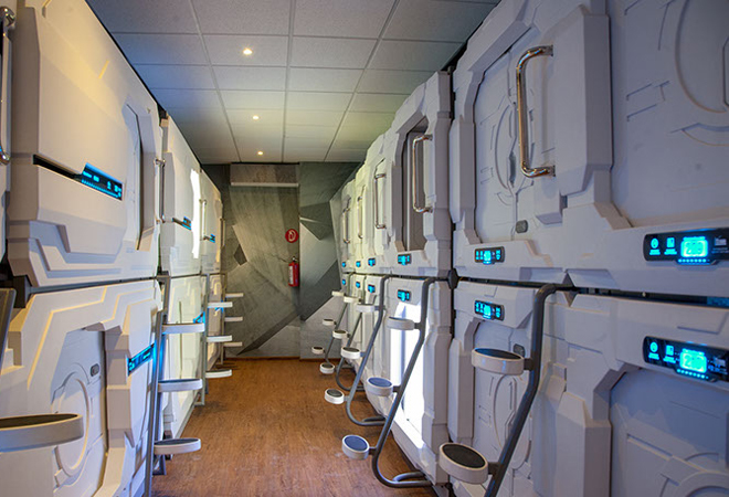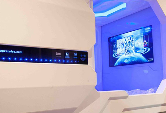 Las cápsulas son para una sola persona y están equipadas con puertos USB, televisión, caja de seguridad, control de iluminación, espejo, extintor y botón de emergencia.