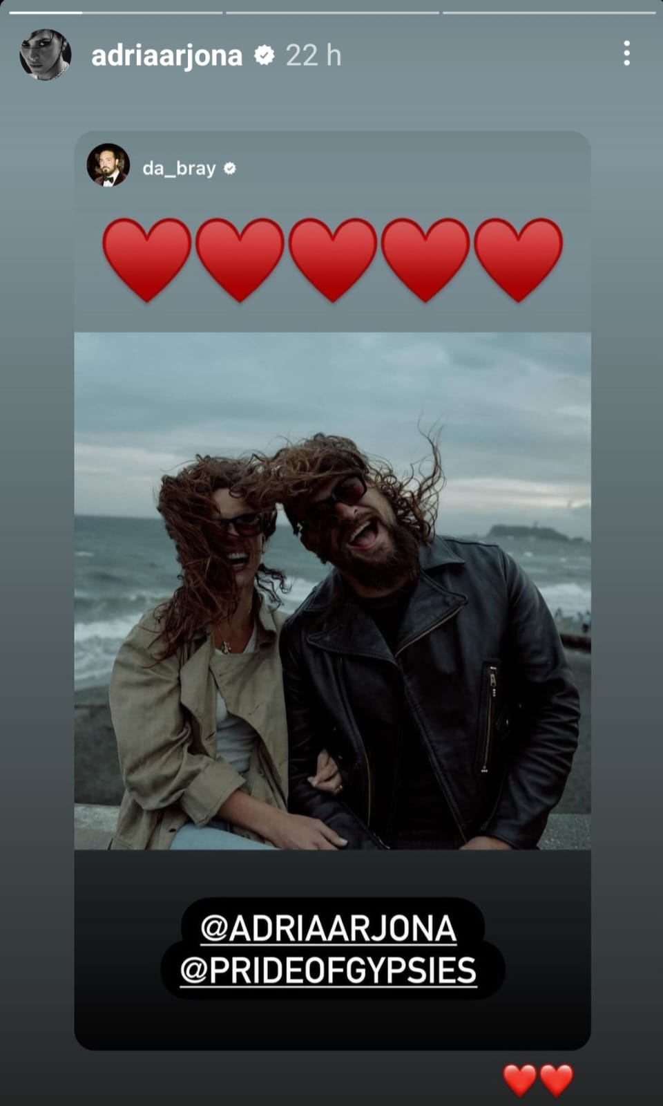 Adria no ha subido fotos al lado de Jason Momoa, pero sí compartió en sus historias una foto donde están juntos acompañada de corazones rojos.