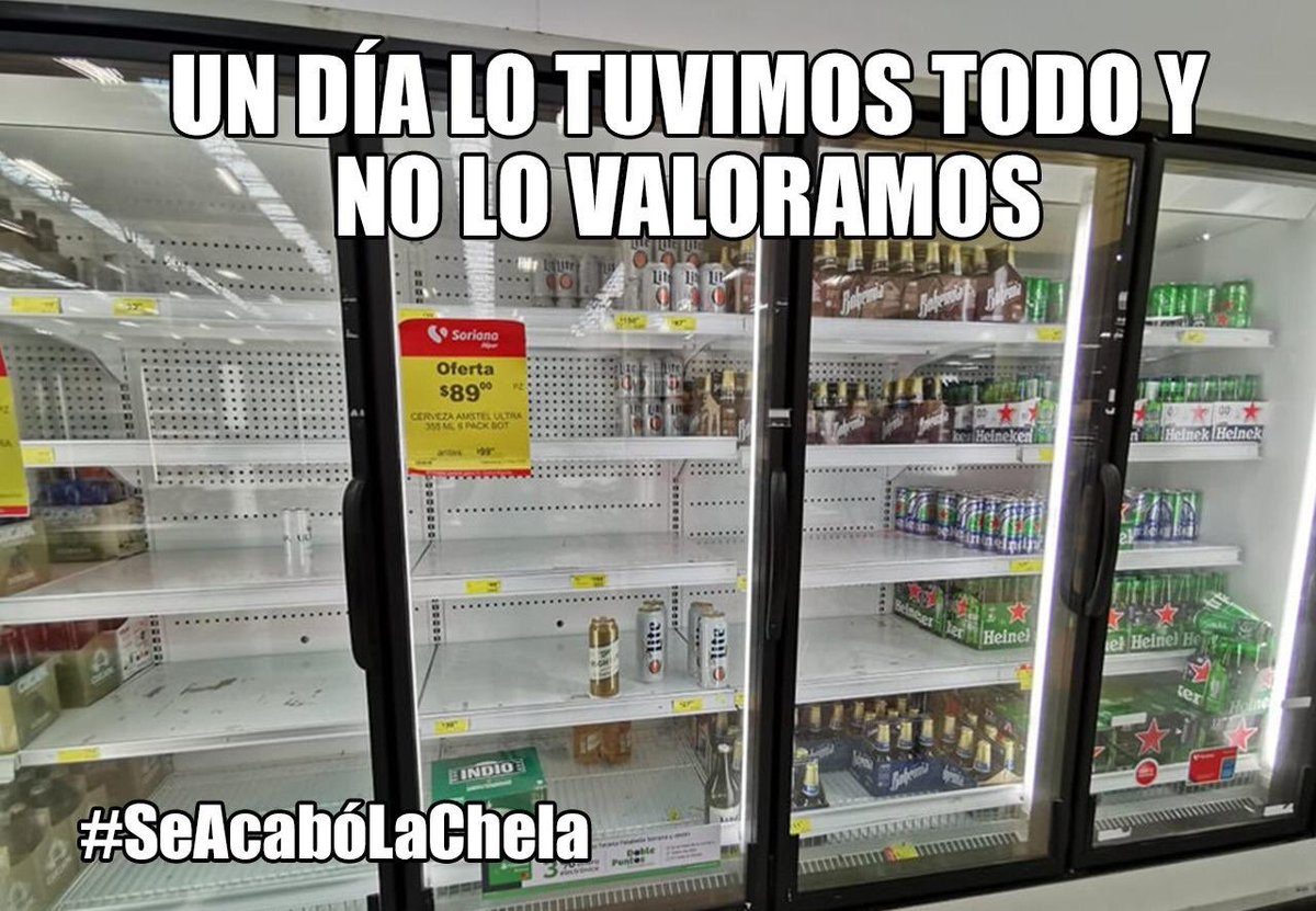 Tras la disposición oficial, Heineken y Grupo Modelo, los principales productores de cervezas en México anunciaron el paro de labores desde el pasado 5 de abril y hasta nuevo aviso. Además, debido a la escasez se ha reportado un aumento de hasta un 30% en los precios de la cerveza, de acuerdo con el presidente de la Alianza Nacional de Pequeños Comerciantes (Anpec), Cuauhtémoc Rivera. En redes sociales han expresado su inconformidad con el hashtag #SeAcabóLaChela.Mientras que otros han aprovechado para compartir memes, aquí te dejamos los mejores.Dijeron que lo peor estaba por venir y tenían razón. ????#SeAcabóLaChela pic.twitter.com/TCwogSH37d