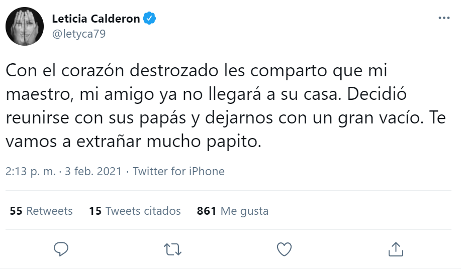 "Con el corazón destrozado les comparto que mi maestro, mi amigo ya no llegará a su casa. Decidió reunirse con sus papás y dejarnos con un gran vacío. Te vamos a extrañar mucho papito", escribió en Twitter.
