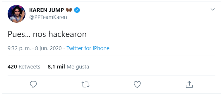 Karen también comentó en su cuenta de Twitter que se encontraba en "Shock", pues los habían hackeado.