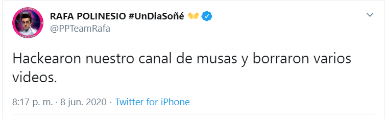 “Hackearon nuestro canal de Musas y borraron varios videos”, escribió Rafa en su cuenta de Twitter.