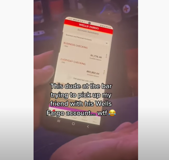 En un video que fue captado por una amiga de la joven, se ve cómo el hombre se acerca a una chica que está sentada en la barra y orgulloso le muestra su aplicación bancaria, donde se ve que tiene 92 mil dólares (cerca de un millón 840 mil pesos mexicanos) en su cuenta.