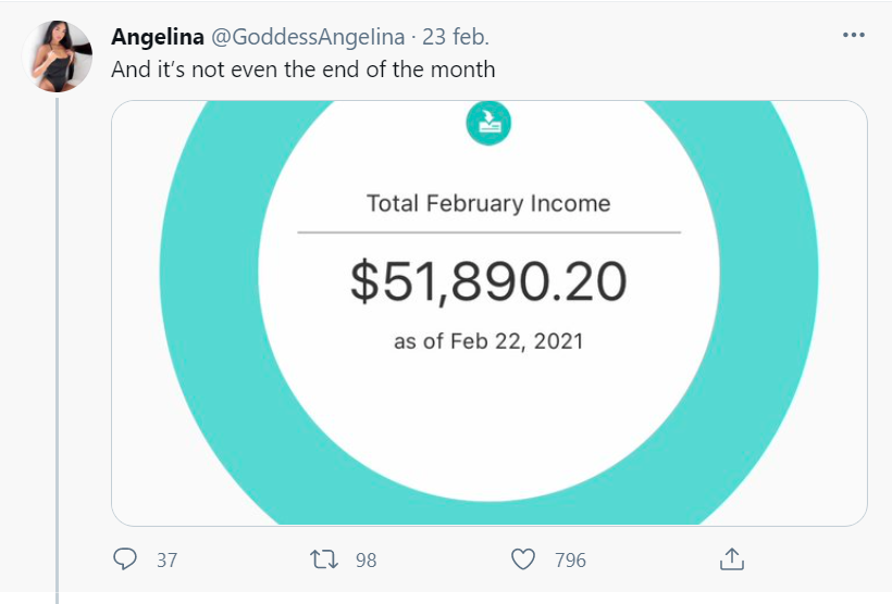 En otra publicación en su cuenta de Twitter, la joven de 26 años compartió una captura de sus ganancias en OnlyFans en febrero, que ascendían a 51 mil 890 dólares (alrededor de un millón 30 mil pesos mexicanos).Onlyfans just bought me a 3 bedroom apartment in Miami ? pic.twitter.com/HM2to9UKwu