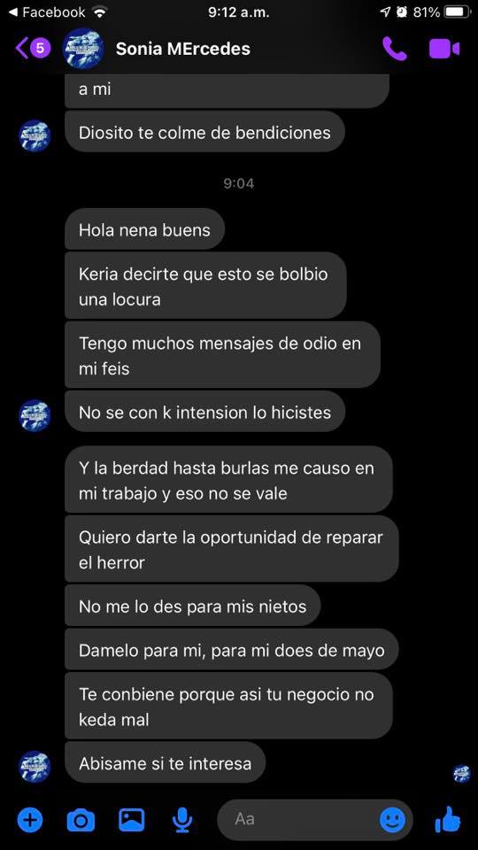 "Quería decirte que esto se volvió una locura, tengo muchos mensajes de odio en mi feis, no sé con que intención lo hiciste y la verdad hasta burlas me causó en mi trabajo y eso no se vale", escribió la clienta.Para compensarla, la mujer llamada Sonia Mercedes le pidió a Marina que le diera un pastel no para sus nietos, sino para ella con motivo del 10 de mayo.