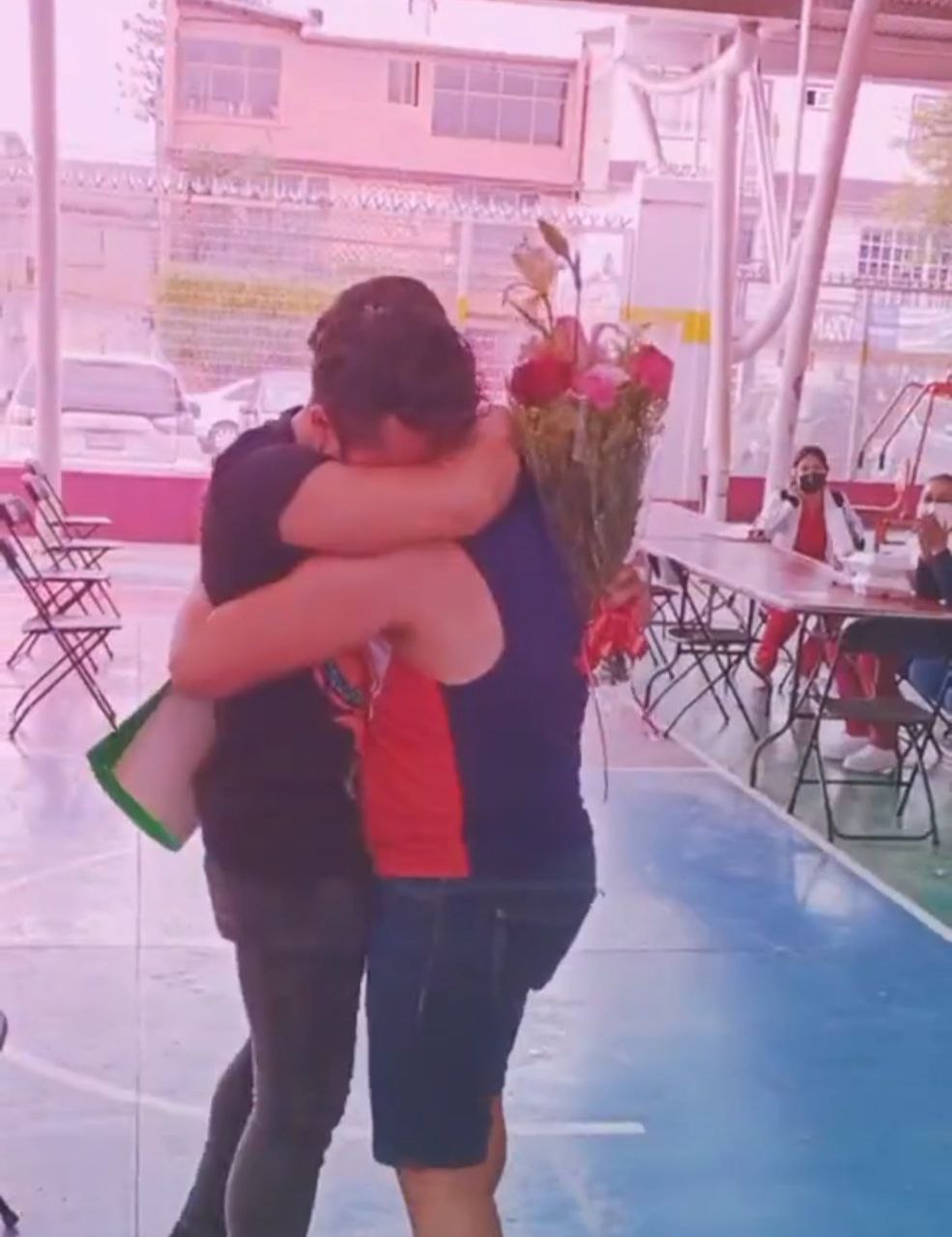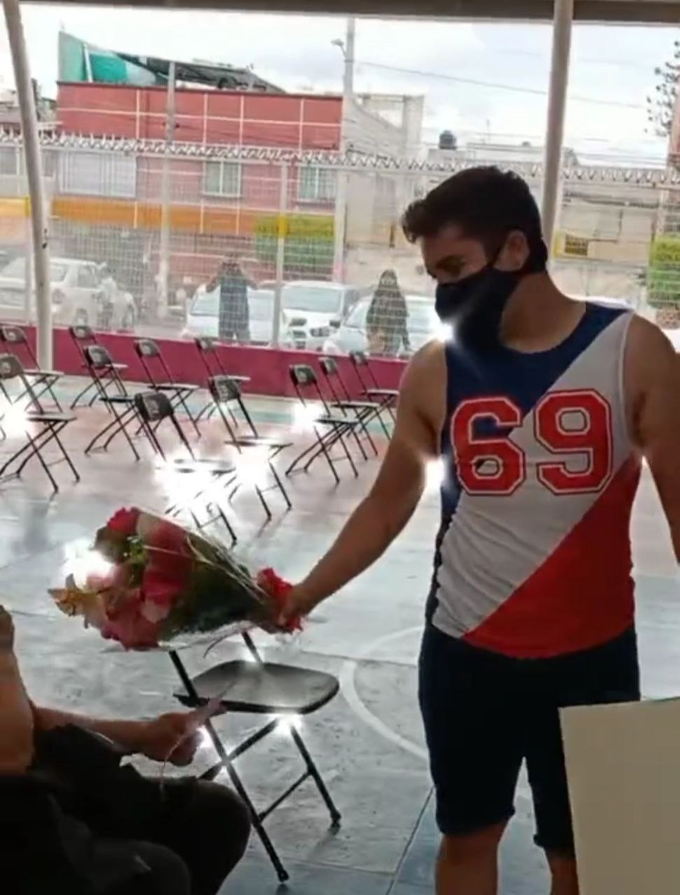 Después de que ambos se vacunaron, el joven le entregó un ramo de flores a Erick y desenrolló una cartulina que decía "¿Quieres andar conmigo?.