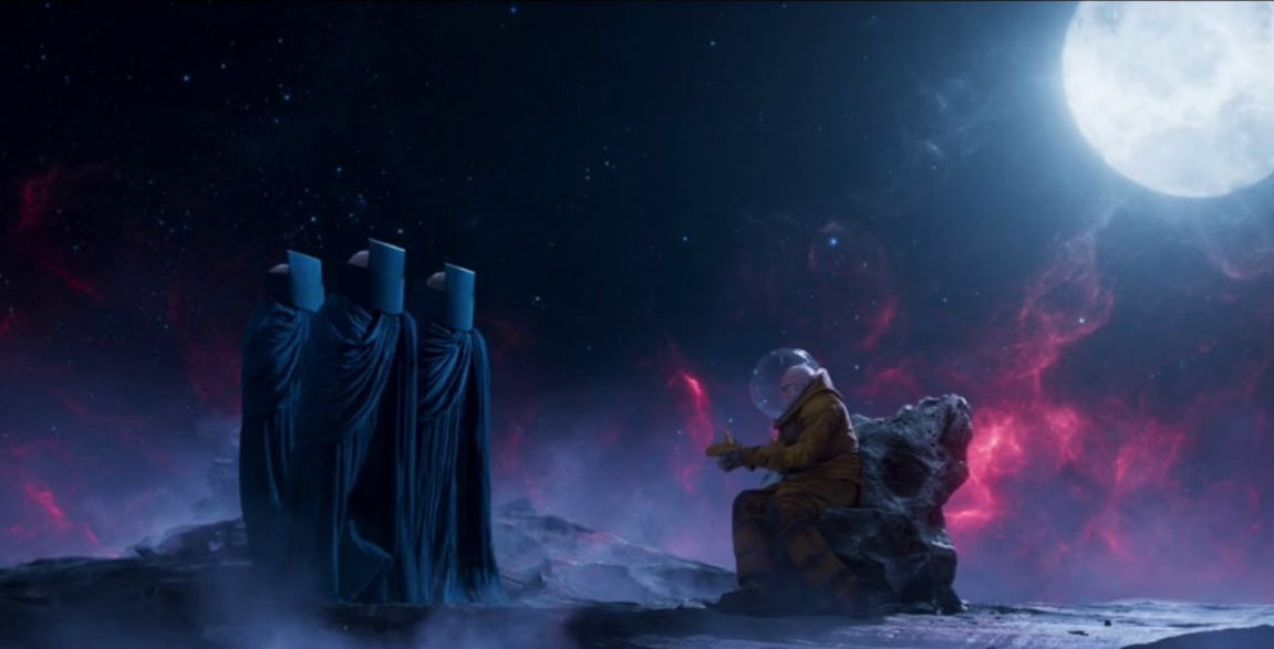 En Guardianes de la Galaxia Vol. 2 Lee está vestido de astronauta y cuenta historias sobre su vida, incluso era repartidor de FedEx.