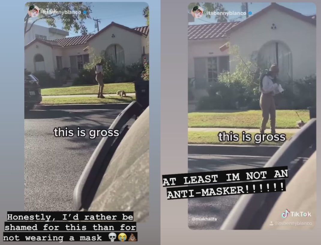 Aunque algunos creen que se trata de un video editado, Khalifa compartió en una de historia de su cuenta de Instagram que prefiere que la avergüencen por eso que por no usar mascarilla.@itsbennyblancoi just saw @miakhalifa put poop on her face♬ original sound - benny blanco