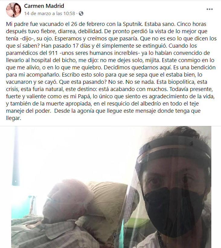 Una semana antes, la actriz compartió con sus seguidores que su padre comenzó a presentar síntomas cinco horas después de que le aplicaran la vacuna Sputnik V."Mi padre fue vacunado el 26 de febrero con la Sputnik. Estaba sano. Cinco horas después tuvo fiebre, diarrea, debilidad. De pronto perdió la vista de lo mejor que tenía -dijo-, su ojo. Esperamos y creímos que pasaría. ¿Qué no es eso lo que dicen los que sí saben?", escribió Madrid.En la misma publicación, la actriz resaltó que su padre estaba bien hasta que lo vacunaron y "se cayó".