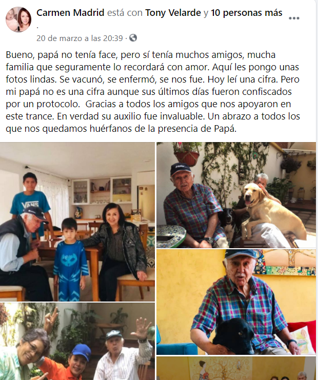 "Se vacunó, se enfermó, se nos fue. Hoy leí una cifra. Pero mi papá no es una cifra aunque sus últimos días fueron confiscados por un protocolo. Gracias a todos los amigos que nos apoyaron en este trance. En verdad su auxilio fue invaluable", escribió la actriz en su cuenta de Facebook el pasado 20 de marzo.
