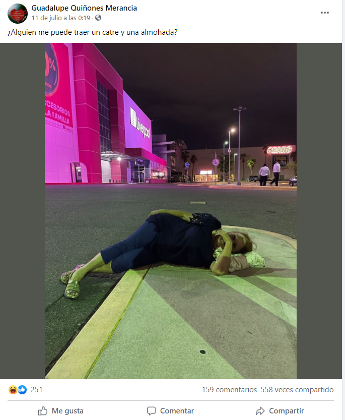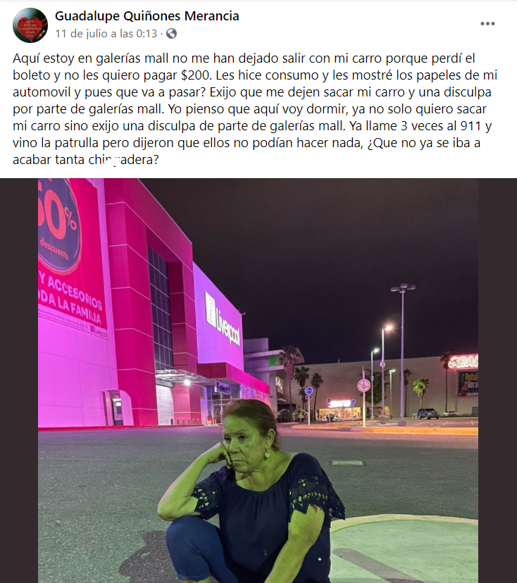 "No me han dejado salir con mi carro porque perdí el boleto y no les quiero pagar $200. Les hice consumo y les mostré los papeles de mi automóvil y pues ¿qué va a pasar? Exijo que me dejen sacar mi carro y una disculpa por parte de galerías mall", escribió la mujer junto a una fotografía sentada en el piso.Ante la negativa del personal de la plaza para dejarla salir sin pagar la multa por boleto perdido, la mujer decidió quedarse a dormir en el estacionamiento a modo de protesta.
