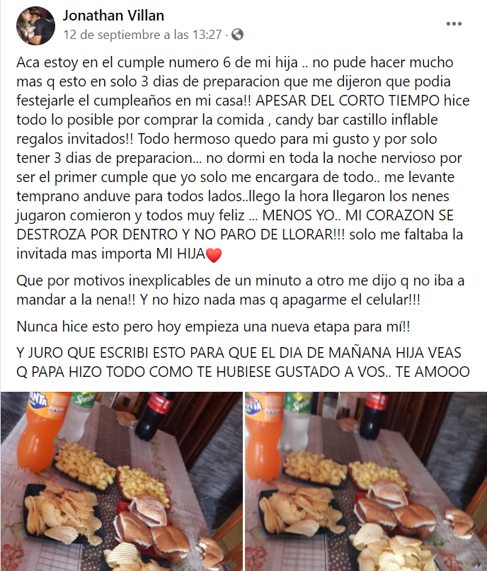 Jonathan Villán, un padre originario de Argentina, preparó con esmero una fiesta para celebrar el cumpleaños número 6 de su hija, pero vivió una desilusión cuando su expareja no le llevó a la niña.