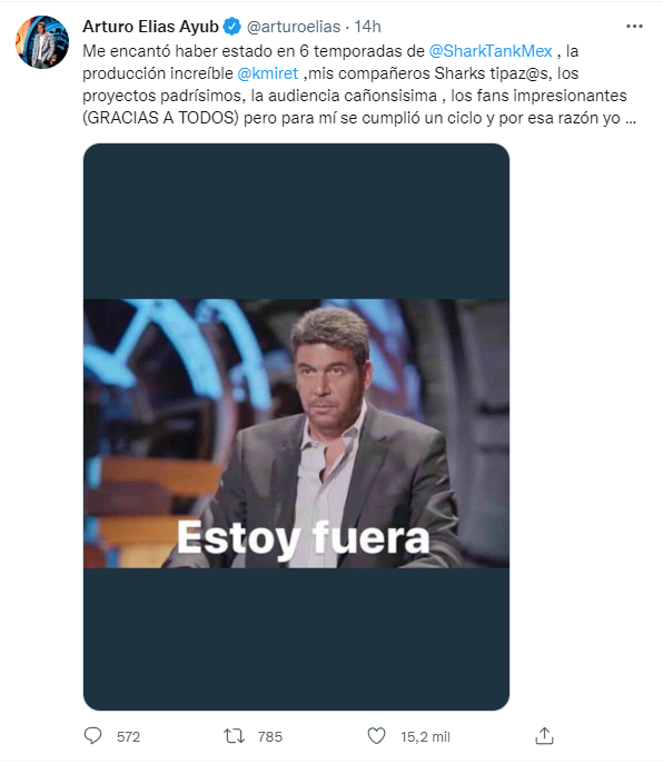 “Me encantó haber estado en 6 temporadas de @SharkTankMex, la producción increíble @kmiret, mis compañeros Sharks tipaz@s, los proyectos padrísimos, la audiencia cañonsísima , los fans impresionantes (GRACIAS A TODOS) pero para mí se cumplió un ciclo y por esa razón yo... Estoy fuera”, escribió Arturo Elías Ayub en Twitter.[caption id="attachment_80409" align="aligncenter" width="495"]