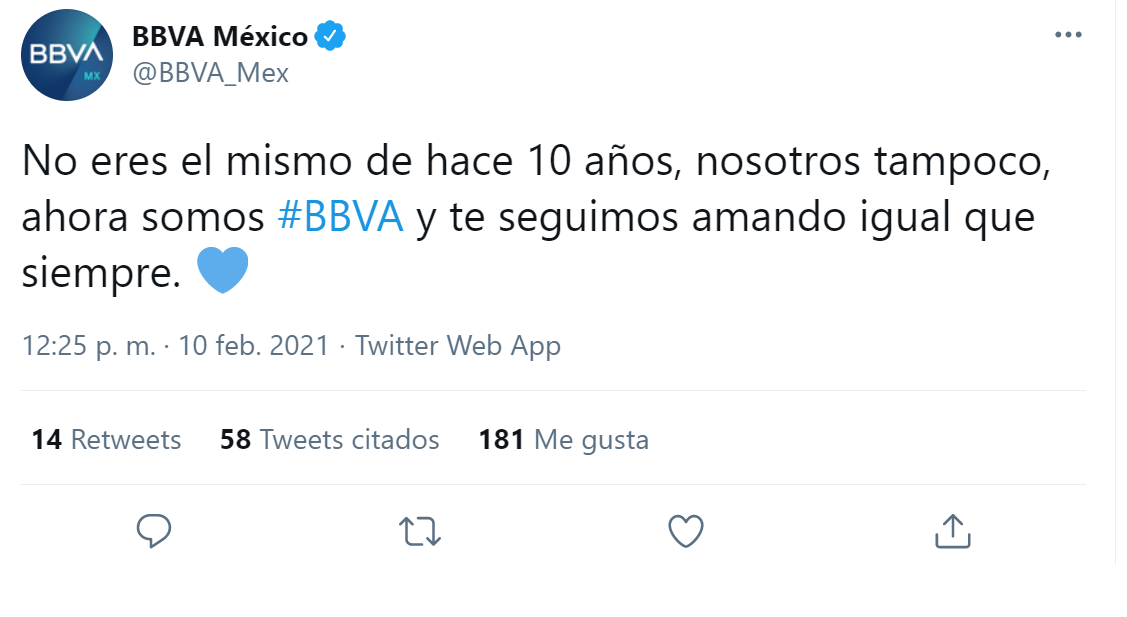Además, en su cuenta de Twitter el banco escribió: "No eres el mismo de hace 10 años, nosotros tampoco, ahora somos #BBVA y te seguimos amando igual que siempre".