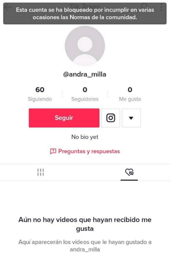 Al ingresar a su cuenta @andra_milla, se encuentra la leyenda: "Esta cuenta se ha bloqueado por incumplir en varias ocasiones las Normas de la comunidad", sin aclarar cuales normas rompió.