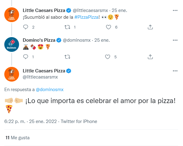 "¡Lo que importa es celebrar el amor por la pizza!", escribió el CM de Little Caesars.TAMBIÉN TE PUEDE INTERESAR: Little Caesars lanza pizza inspirada en Batman y causa sensación en redes sociales A los clientes disfrutan observar este tipo de interacciones entre las marcas, ya sea para aumentar la competencia o para unirse, en ambos casos les funciona como publicidad.