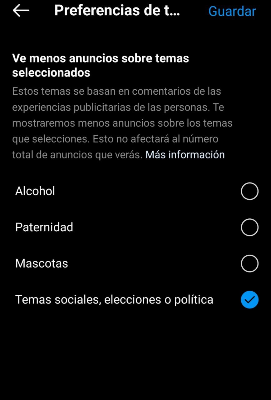 En Instagram el proceso es casi el mismo, pero sólo permite hacerlo desde dispositivos móviles. 1. Ingresa a la pestaña de configuración. 2. Luego ve a la opción de anuncios. 3. Selecciona temas de anuncios. 4. Selecciona los temas que prefieres ver menos y dale en guardar.