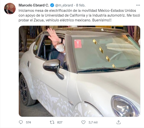 “Iniciamos mesa de electrificación de la movilidad México-Estados Unidos con apoyo de la Universidad de California y la industria automotriz. Me tocó probar el Zacua, vehículo eléctrico mexicano. Buenísimo!!”, escribió Ebrard en Twitter.
